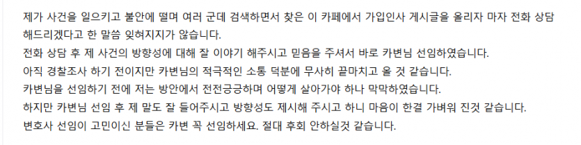 제가 사건을 일으키고 불안에 떨며 여러 군데 검색하면서 찾은 이 카페에서 가입인사 게시글을 올리자 마자 전화 상담 해드리겠다고 한 말씀 잊혀지지가 않습니다.