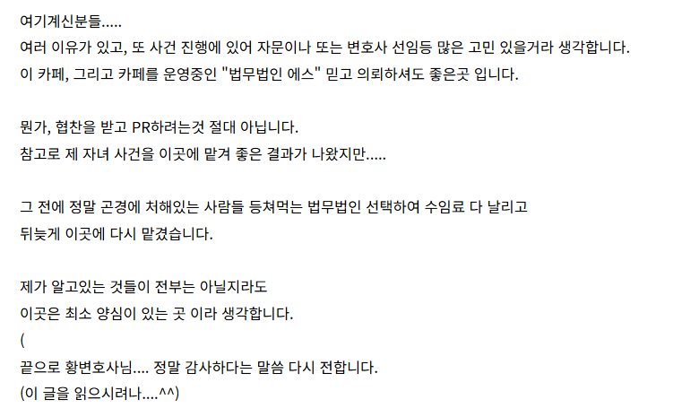 이 카페, 그리고 카페를 운영중인 "법무법인 에스" 믿고 의뢰하셔도 좋은곳 입니다.