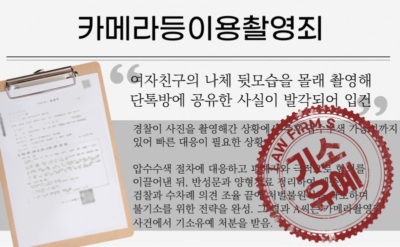 기소유예 카메라등이용촬영죄 25-05-22 사건 요약 여자친구의 나체 뒷모습을 몰래 촬영해단톡방에 공유한 사실이 발각되어 입건경찰이 사진을 촬영해간 상황에서 추후 압수수색 가능성까지있어 빠른 대응이 필요한 상황.압수수색 절차에 대응하고 피해자와 극적으로 합의를이끌어낸 뒤, 반성문과 양형자료 정리하여 제출.검찰과 수차례 의견 조율 끝에 처벌불원서를 확보하며불기소를 위한 전략을 완성. 그 결과 A씨는 카메라촬영죄사건에서 기소유예 처분을 받음. 이전글 카메라등이용촬영죄 25.05.29 다음글 카메라등이용촬영죄 25.05.20 목록