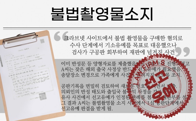 공판기록을 면밀히 검토하여 새로운 변호인 의견서 제출. 의뢰인의 반성 태도와 출입국 불이익 사정을 강조하고 유사 사건에서 선고유예가 인정된 판례를 첨부해 재판부를 설득. 그 결과 A씨는 불법촬영물 소지 사건에서 1심 공판단계에서 선고유예 판결을 받게 됨. |