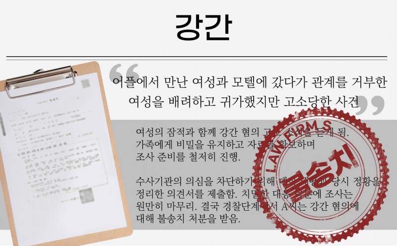 불송치 강간 25-07-29 사건 요약 어플에서 만난 여성과 모텔에 갔다가 관계를 거부한여성을 배려하고 귀가했지만 고소당한 사건 여성의 잠적과 함께 강간 혐의 고소 소식을 듣게 됨.가족에게 비밀을 유지하고 자료를 확보하며조사 준비를 철저히 진행.수사기관의 의심을 차단하기 위해 대화 내용과 당시 정황을정리한 의견서를 제출함. 치밀한 대응 덕분에 조사는원만히 마무리. 결국 경찰단계에서 A씨는 강간 혐의에대해 불송치 처분을 받음. 이전글 통신매체이용음란죄 25.07.31 다음글 강제추행죄 25.07.24 목록