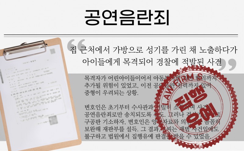 변호인은 초기부터 수사관과 긴밀히 소통하여 사건을 공연음란죄로만 송치되도록 유도. 그러나 검사가 곧바로 구공판 기소하자, 변호인은 양형자료와 의견서를 꼼꼼히 보완해 재판부를 설득. 그 결과, A씨는 재범 사건임에도 불구하고 법원에서 집행유예 판결을 받을 수 있었음. |